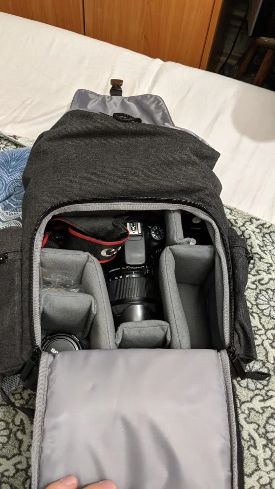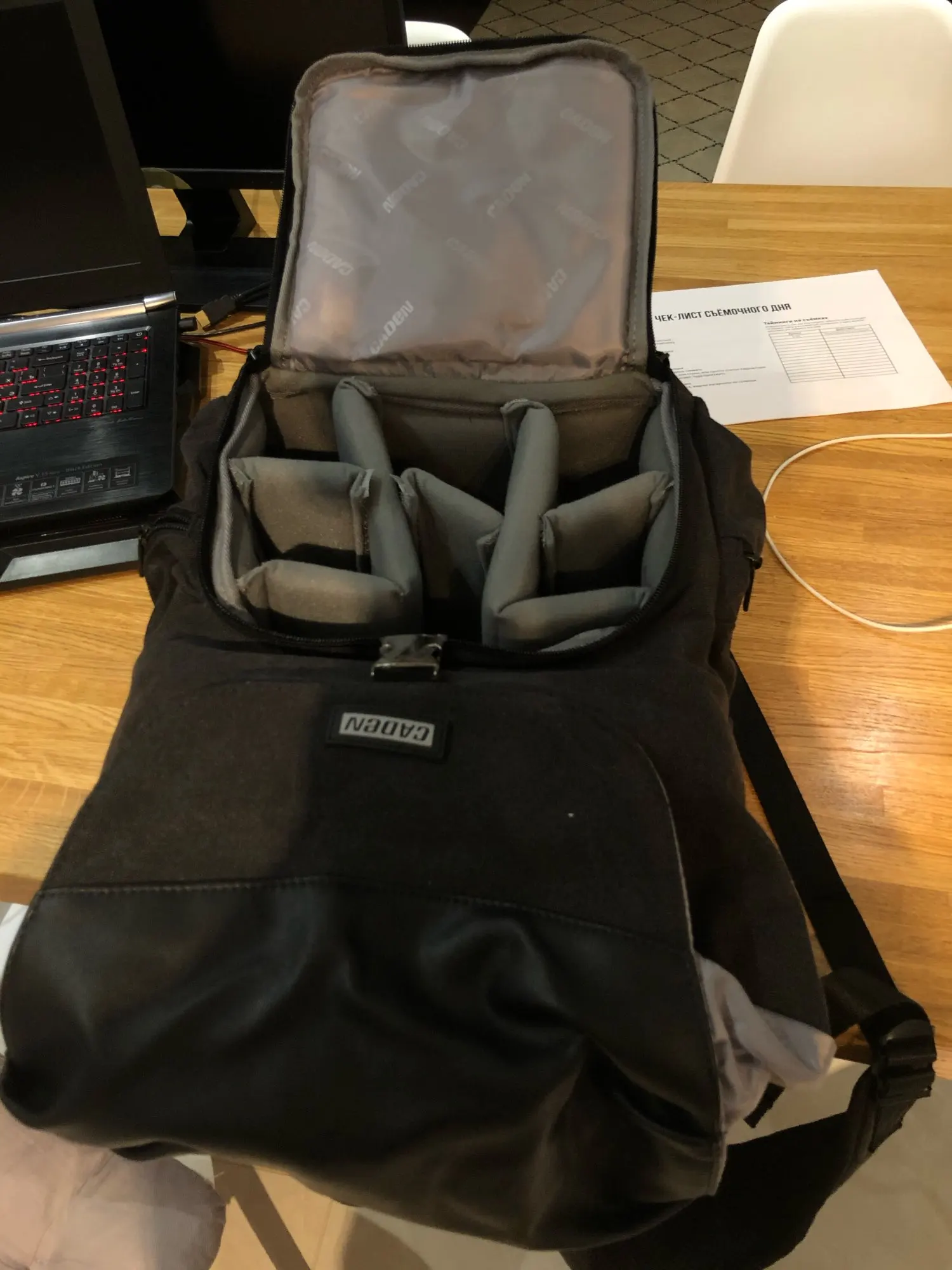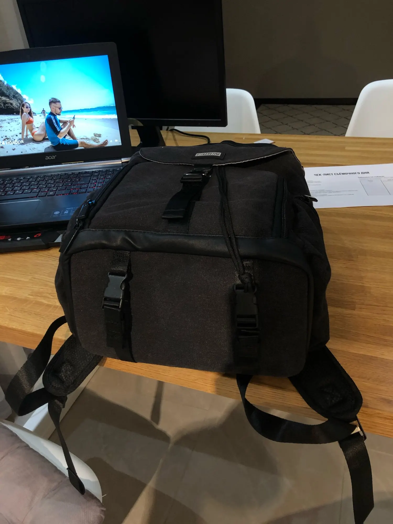 Рюкзак очень стильный и вместительный 🙂 поместилось 2 камеры, 3 объектива, вспышка и палантин шерстяной))