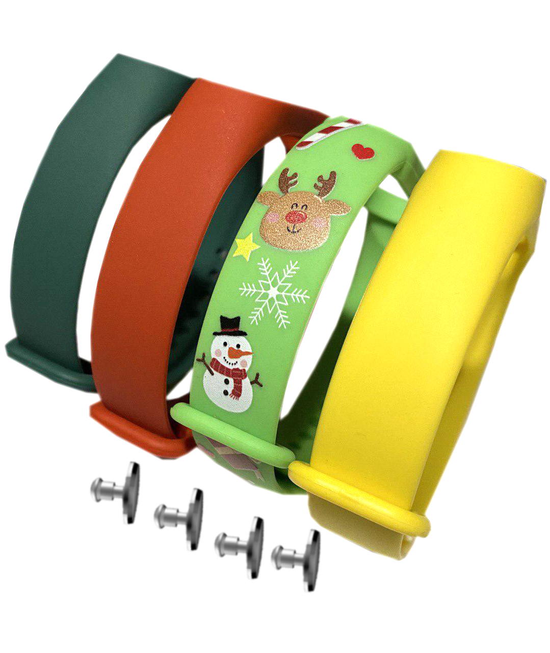 Комплект силиконовых ремешков MRK для Xiaomi Mi Band 4/3 Новогодний Joy (четыре ремешка: темно-зеленый, красный, салатовый, желтый)+ 4 металические кнопки Комплект силиконовых ремешков MRK для Xiaomi Mi Band 4/3 Новогодний Joy (четыре ремешка: темно-зеленый, красный, салатовый, желтый)+ 4 металические кнопки