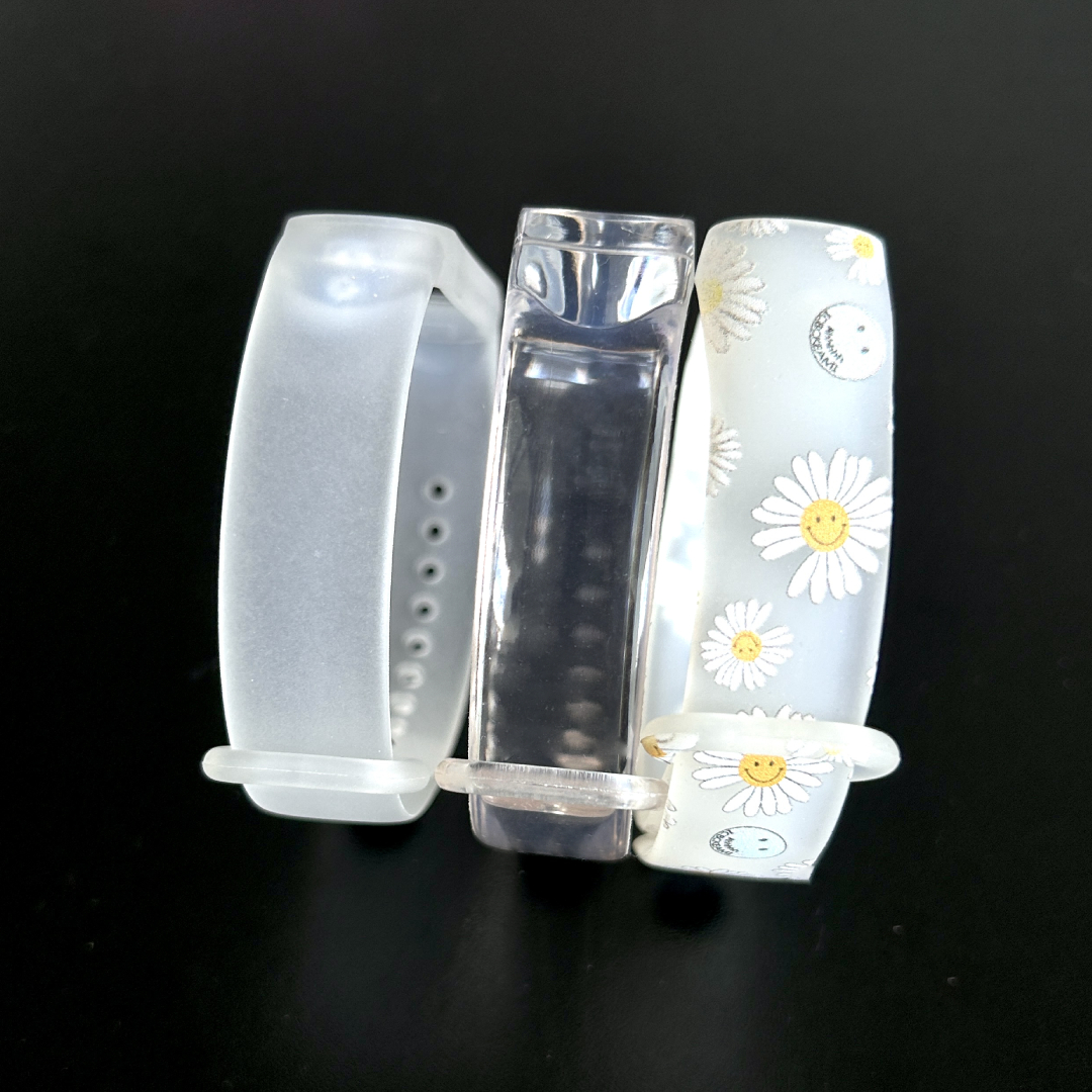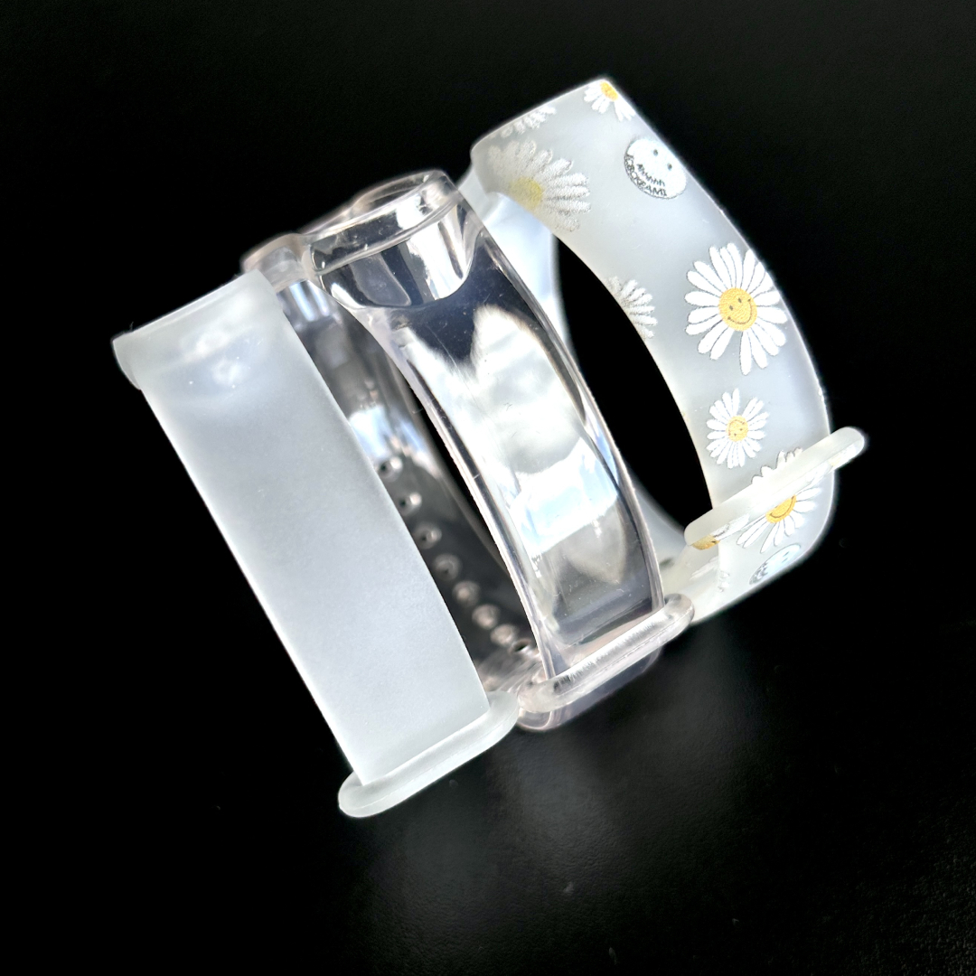 Комплект состоит из трех ремешков : прозрачный матовый белый ремешок с принтом «Ромашки», прозрачный матовый белый ремешок, прозрачный глянцевый ремешок.