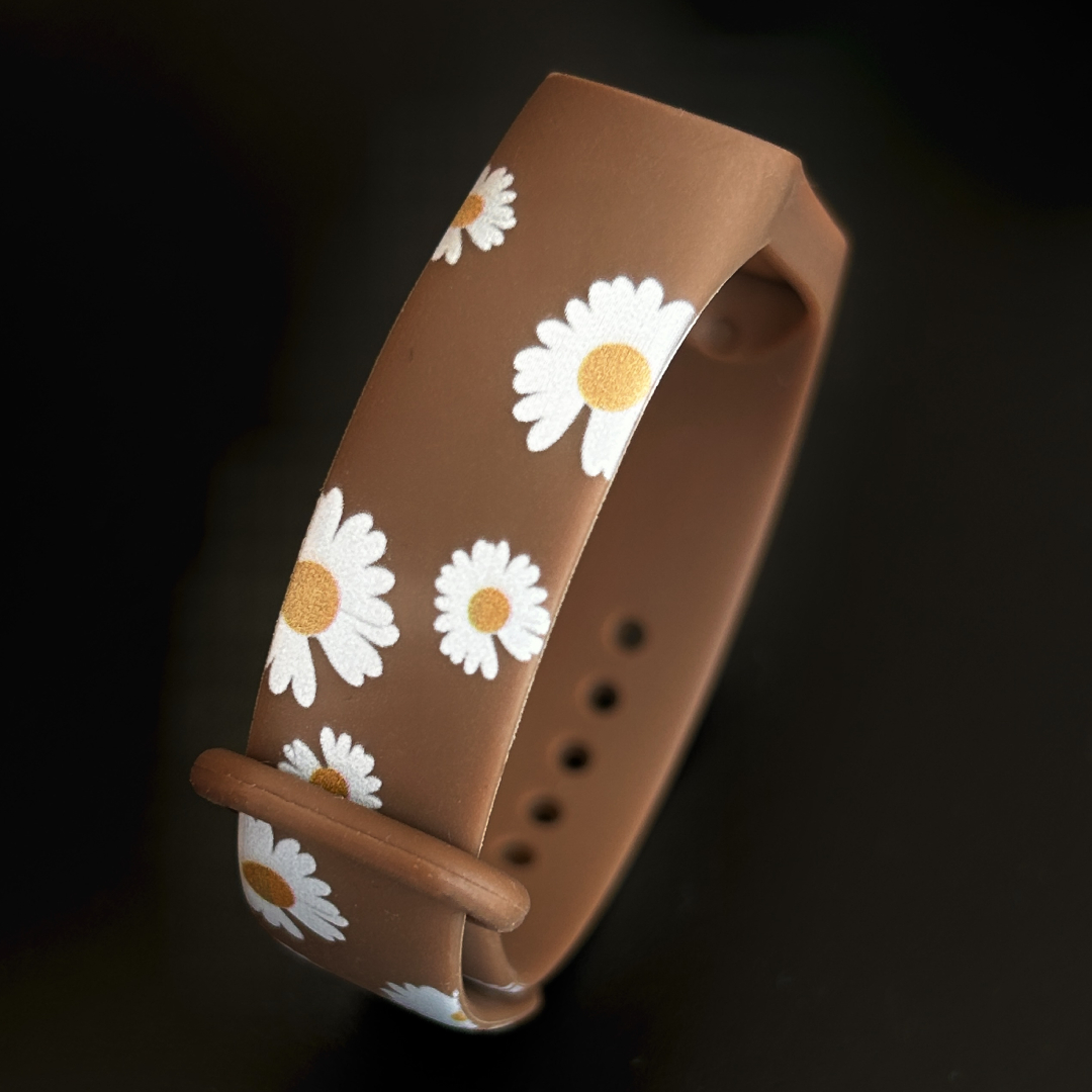 Силиконовый ремешок MRK для фитнес браслета Xiaomi Mi Band 3/4 изготовлен из прочного и практичного материала. Его дизайнерский ромашковый принт превратит гаджет в оригинальный аксессуар, который станет отличным дополнением модного образа. А металлическая кнопка будет надежно закреплять ремешок на запястье.