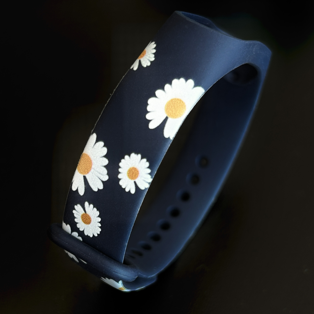 Силиконовый ремешок MRK для фитнес браслета Xiaomi Mi Band 6/5 изготовлен из прочного и практичного материала. Его дизайнерский ромашковый принт превратит гаджет в оригинальный аксессуар, который станет отличным дополнением модного образа. А металлическая кнопка будет надежно закреплять ремешок на запястье.