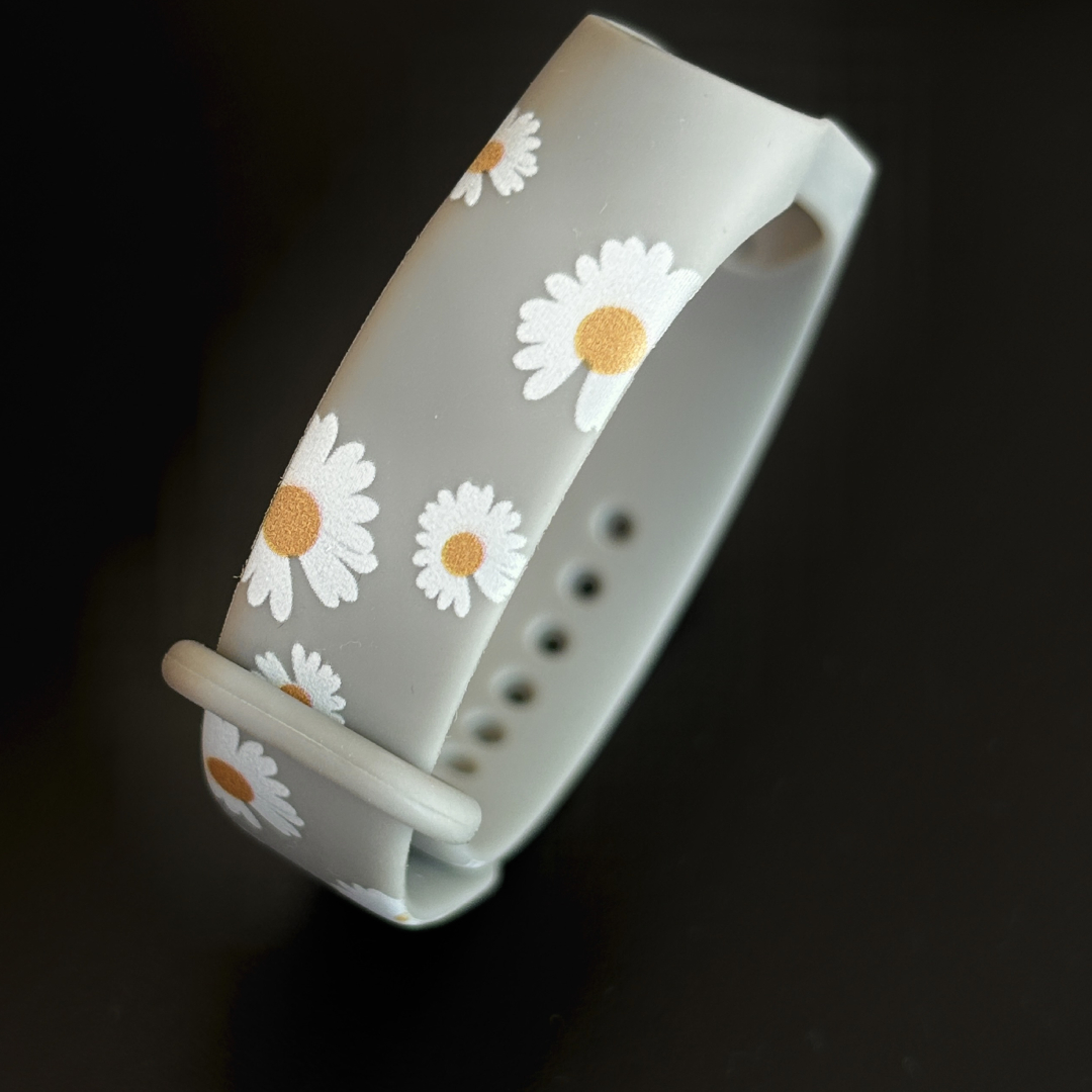 Силиконовый ремешок MRK для фитнес браслета Xiaomi Mi Band 3/4 изготовлен из прочного и практичного материала. Его дизайнерский ромашковый принт превратит гаджет в оригинальный аксессуар, который станет отличным дополнением модного образа. А металлическая кнопка будет надежно закреплять ремешок на запястье.