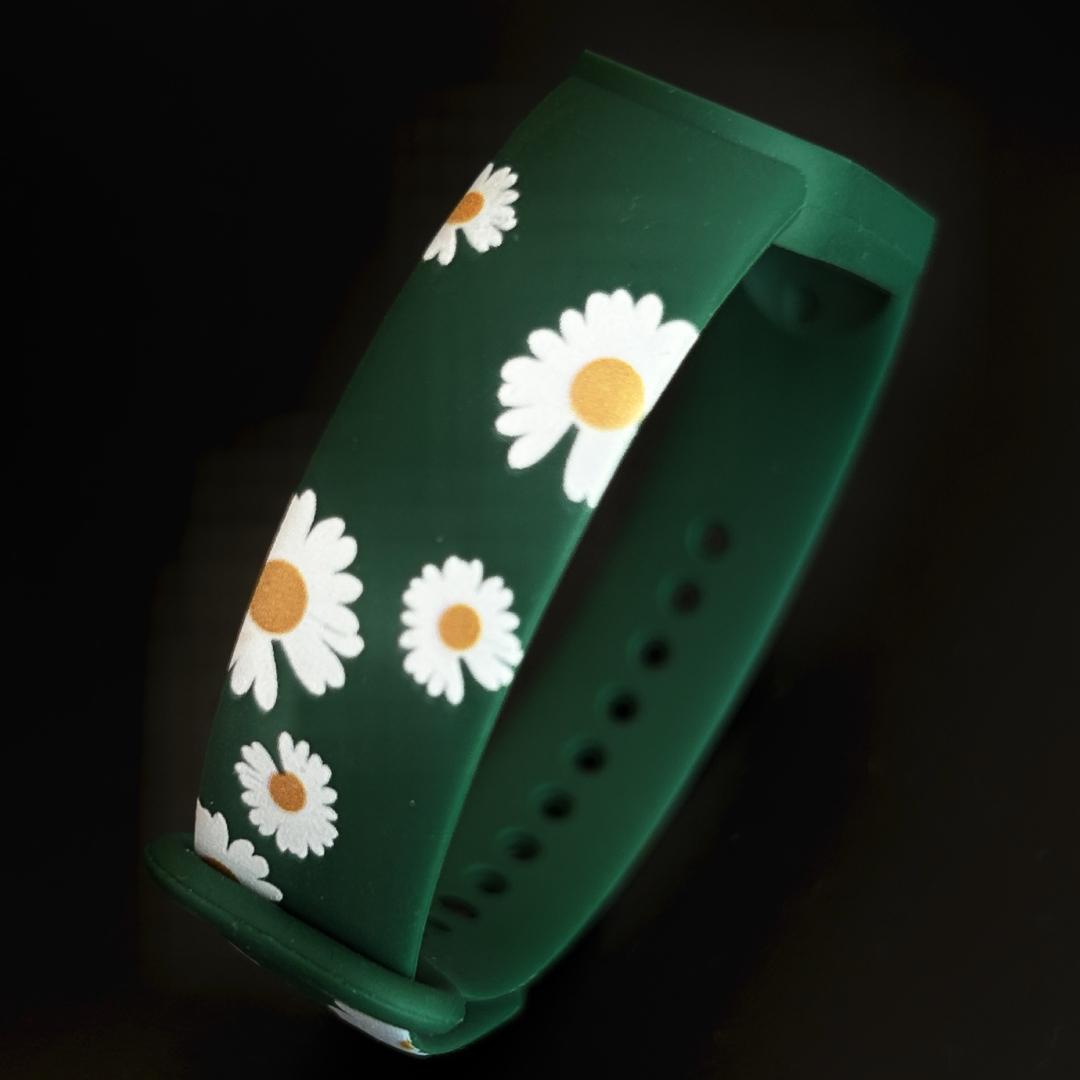 Силиконовый ремешок с дизайнерским рисунком Ромашки MRK для фитнес браслета Xiaomi Mi Band 6/5 темно-зеленый с металлической кнопкой Силиконовый ремешок с дизайнерским рисунком Ромашки MRK для фитнес браслета Xiaomi Mi Band 6/5 темно-зеленый с металлической кнопкой