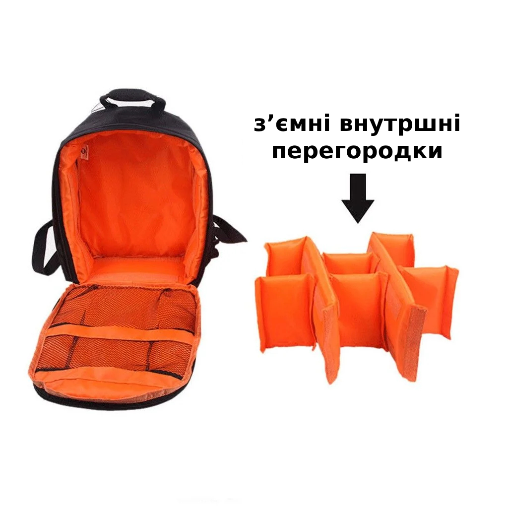 Внешне изделие выглядит как полноценный рюкзак. Внутри предусмотрены специальные ячейки для размещения объектива, зарядного устройства, аккумулятора и др.