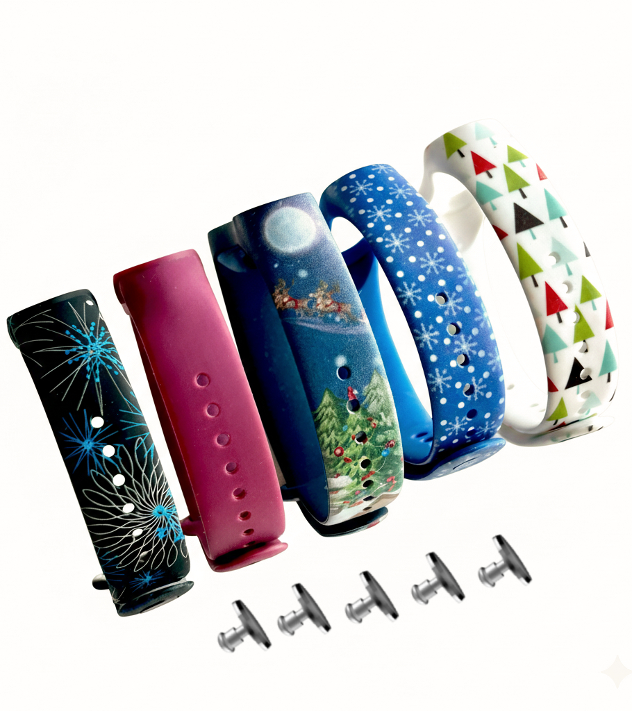 | UkrName | Комплект силіконових ремінців MRK з малюнком Снігова зима для Xiaomi Mi Band 3/4/5/6/7 (5 ремінців + 5 металевих кнопок) |