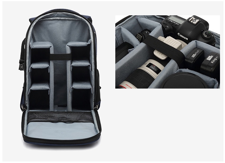 Основне відділення відкривається спереду. Внутрішня оббивка сірого кольору, щільні перегородки, які можна розміщувати як завгодно – вони на липучках. У основному відділенні можна розмістити камеру з об’єктивом, 1-2 спалахи, 2-4 об’єктиви. Відкидна стінка загинається у верхній частині і це дозволяє дістати камеру, не відкриваючи всього рюкзака. На відкидній стінці з внутрішньої сторони є сітчаста кишеня. Окреме відділення для ноутбука із щільними стінками. Відкривається ззаду.