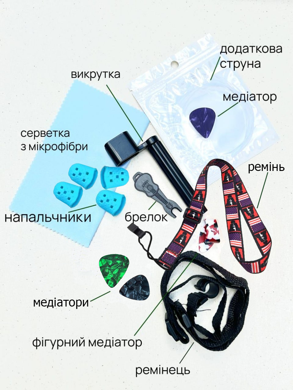 Укулеле (Гавайська гітара) HM100-GB – гавайський чотириструнний щипковий музичний інструмент. Ця Укулеле виготовлена з натурального дерева (порода – Липа), металеві колки забезпечують кришталевий та яскравий звук, а класичні нейлонові струни ідеальні для гри на укулелі. Колір укулеле оригінальний та стильний одночасно. У комплекті з укулеле йде чохол + тюнер для швидкого та легкого налаштування звуку укулеле + комплект аксесуарів з 11 предметів. Цей комплект повністю закриває всі потреби для відмінного старту навчання гри на укулелі. Оскільки в наборі є всі необхідні інструменти та аксесуари, Ви або Ваша дитина матиме все необхідне для легкої та швидкої гри на укулелі. За допомогою тюнера, що йде в комплекті, Ви швидко та з легкістю налаштуєте струни для ідеального звуку укулеле! Комплект аксесуарів складається з 11 предметів: