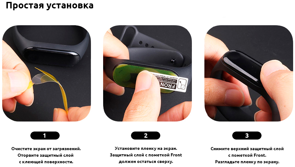 - Встановіть плівку на Mi Band. Зверніть увагу, що захисний шар із написом Front повинен залишитися зверху.